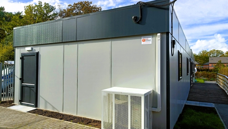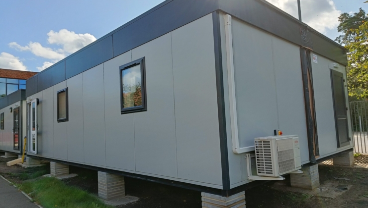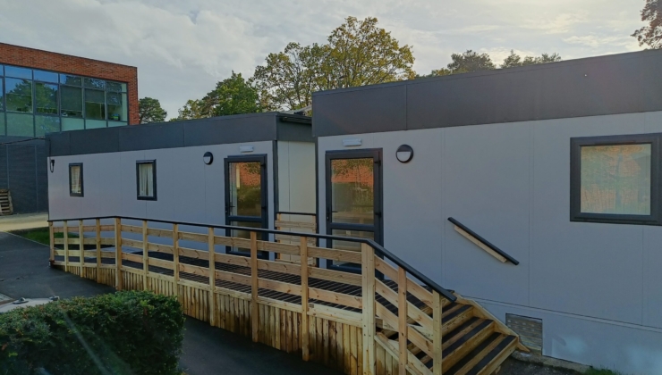 Our modules are meticulously crafted in the factory and fitted out to the highest standards, ensuring exceptional quality. Designed with practicality in mind, they seamlessly blend into the school surroundings. Finished with light grey plastisol steel cladding and anthracite trims, windows, and doors, the modules perfectly complement the existing school building. The cladding not only offers durability but also requires minimal maintenance and is resistant to vandalism, presenting a cost-effective and flexible solution.